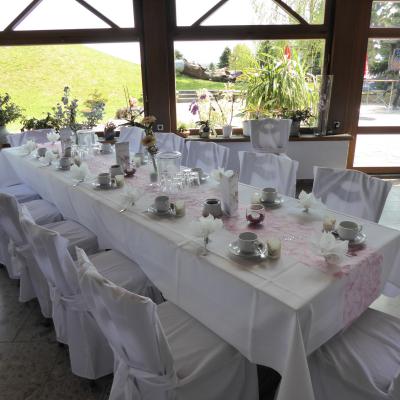 Geeignet für kleine und mittelgroße Familienfeiern. Die Wände sind gestaltet mit den 3 Burgen und Schlössern unserer Region.